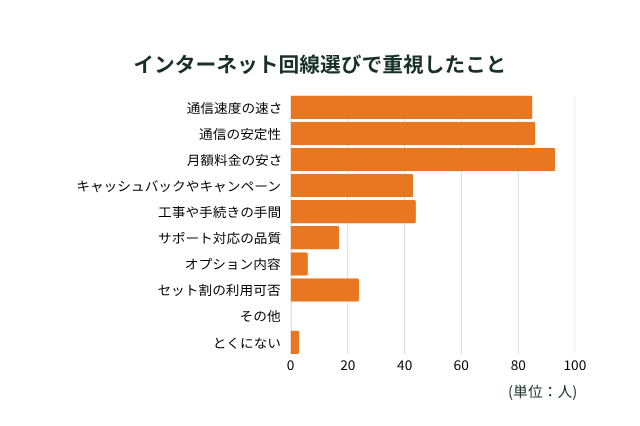 つづいて、インターネット回線を選ぶ時に重視したポイントについても質問しました。