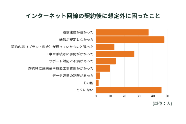 最後に、インターネット回線を契約した後で想定外に困ったことや後悔したことについても質問しました。