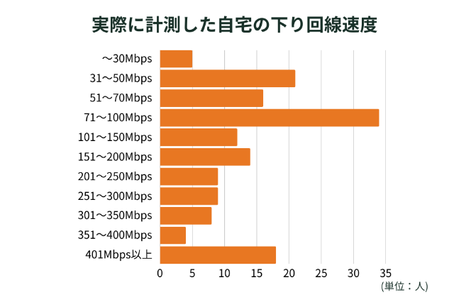 オンラインゲームにとくに必要な下りの回線速度についてアンケート調査したところ、多くの方が50Mbpsを超えていました。実際に普段ゲームをする方は、前述の目安の回線速度を確保できていることが多いようです。