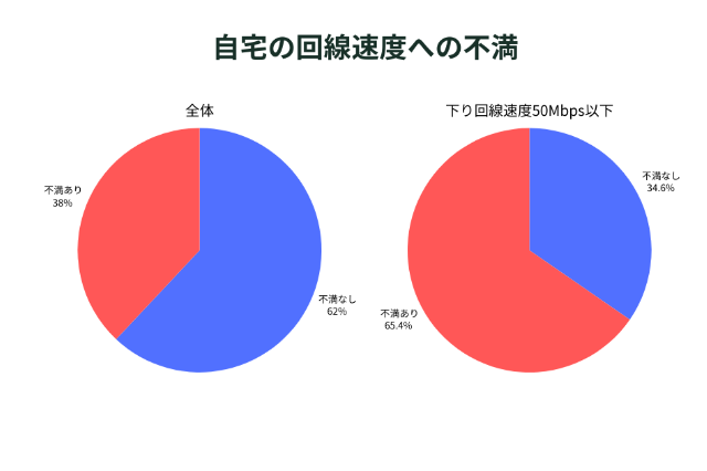 回線速度に対する満足度を調査したところ、下りの回線速度が50Mbps以下だった方の場合は65%以上の方が回線速度に不満を感じており、全体と比較しても高い水準になっています。