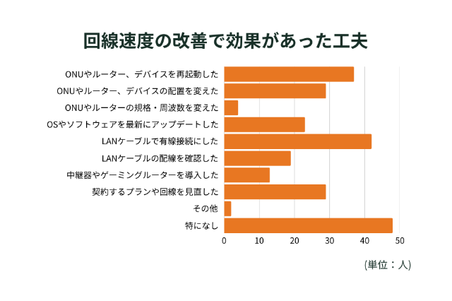 回線速度を改善する方法として実際に効果があったものを調査したところ、「ONU(光回線終端装置)やルーター、デバイスを再起動した」、「LANケーブルで有線接続にした」などの回答が多く集まりました。これらはすぐに実践できる方法なので、現在の回線速度に不満を感じている場合は試してみてはいかがでしょうか。回線速度を改善する方法については、後ほど詳しく解説します。
