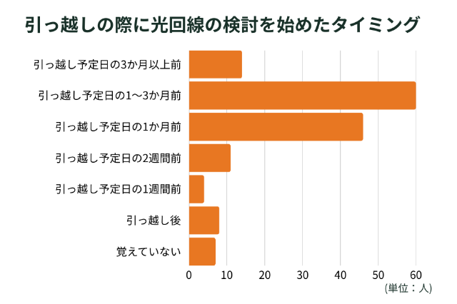 アンケートの結果によると、多くの方が「引っ越し予定日の1か月前」や「引っ越し予定日の1~3か月前」に検討を始めています。スムーズに契約を進めるために、なるべく早めに検討を進めるのがおすすめです。