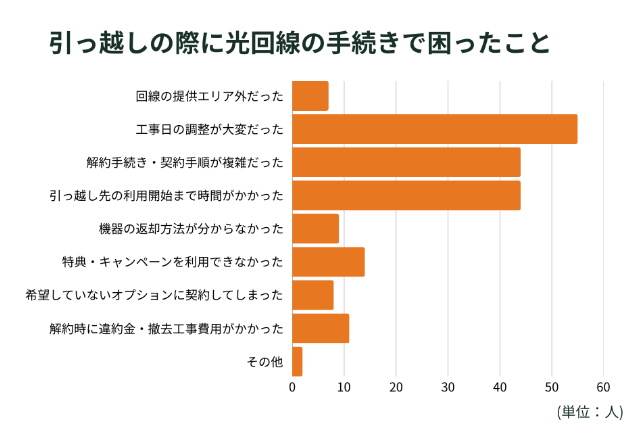 手続き関連で困ったこととして、「工事日の調整」、「手続きの複雑さ」、「利用開始までの時間」が多く挙げられていました。早めに動き出すことで、工事日の調整が進めやすくなります。手続きについては契約の際に困らないよう、事前に手順をよく確認しておくと良いでしょう。また、利用開始まで時間がかかってしまう場合は、前述の通りモバイルルーターの活用などを検討しましょう。