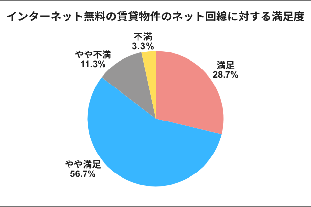 「満足」「やや満足」を選んだ方が全体の85%を超える結果となりました。インターネット無料の賃貸物件について、入居した方の満足度は全体的に高めであることがわかります。