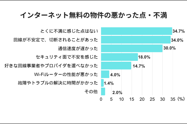 「とくに不満に感じたことはない」と回答したユーザーが最も多い結果となりました。一方で、回線の安定性や通信速度に不満を感じたユーザーも30%ほど見られます。前述のとおり、なかには回線品質が低い物件もあるため、高品質な回線でインターネットを利用したい方は注意しましょう。