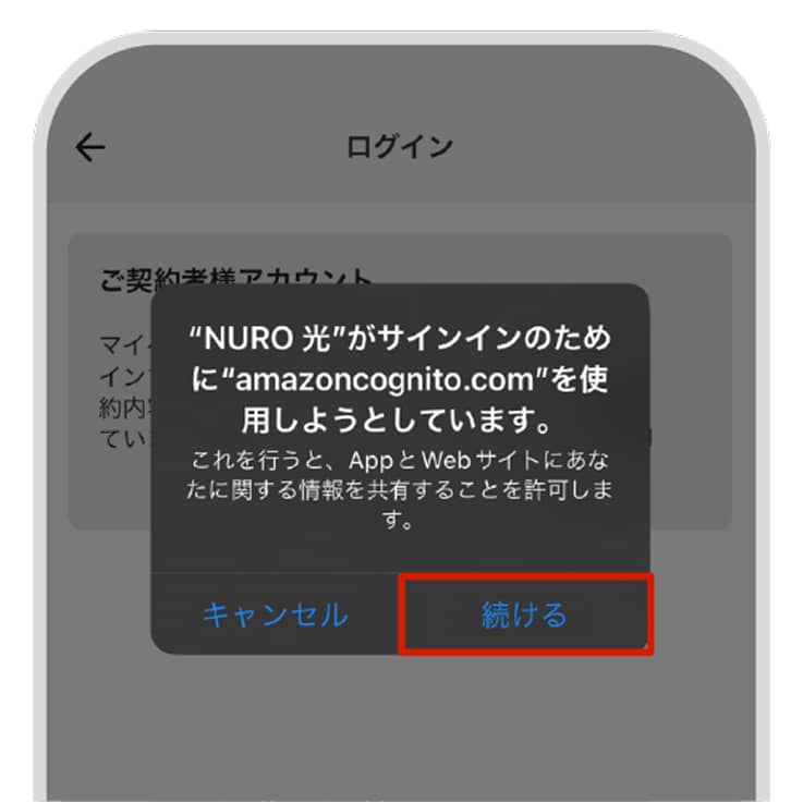 「"NURO 光" がサインインのために"amazoncognito.com"を使用しようとしています。」とでてきたら、「続ける」をタップしてください。