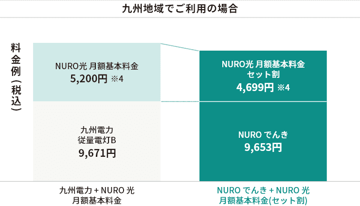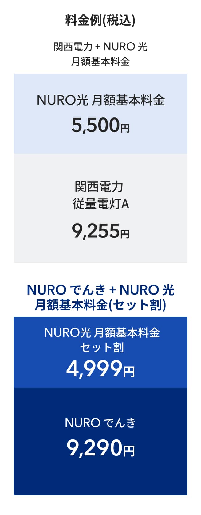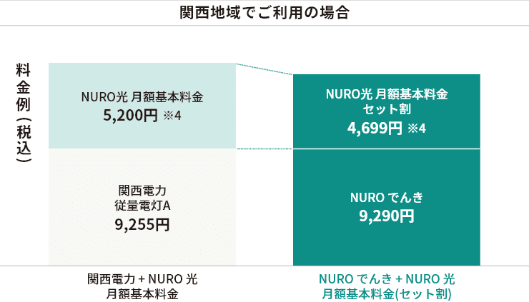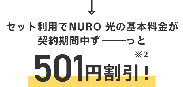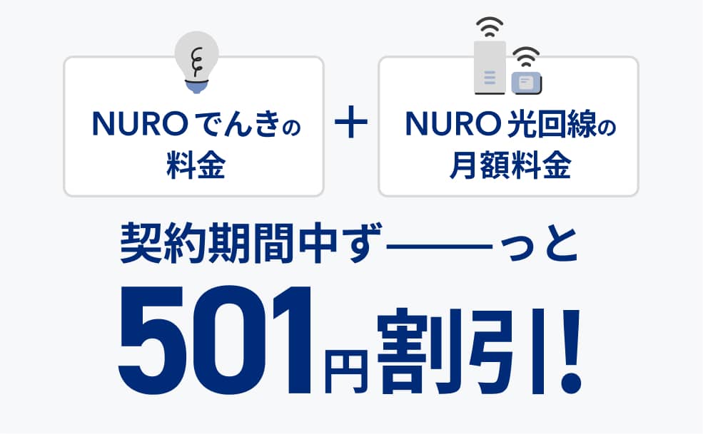 本割引は、お申し込みいただいた「NURO 光」が開通し、かつ別途新規にお申し込みされた、「NUROでんき各種プラン」の供給が開始された月の翌月の「NURO 光」の基本月額料金から適用となります。ただし、他のキャンペーンの併用等で割引後の「NURO 光」基本月額料金が0円未満となる場合、当該月の基本月額料金は0円といたします。