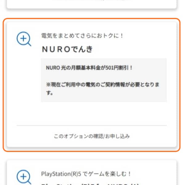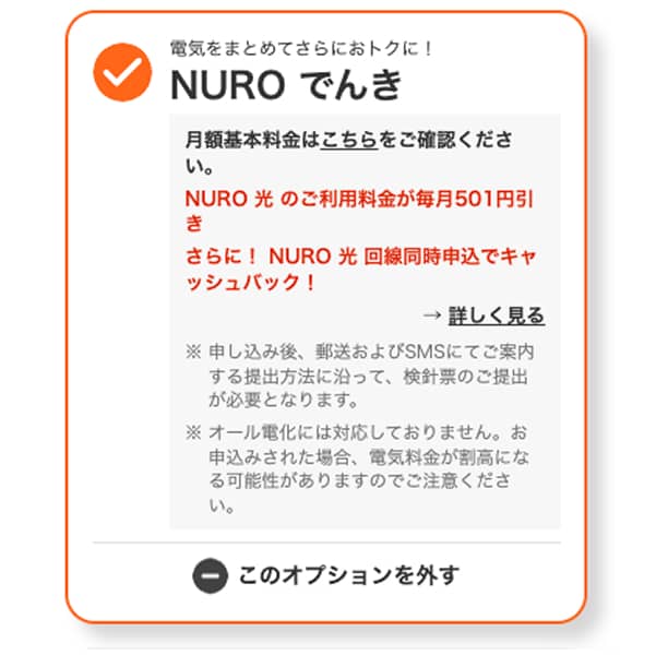 NURO 光のお申し込みフォーム、オプション選択画面で「NURO でんき」を選択