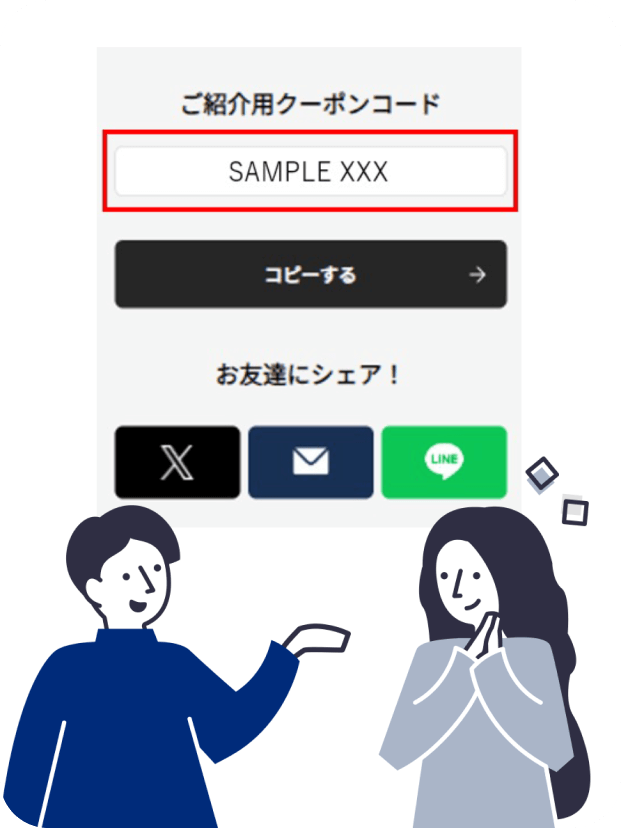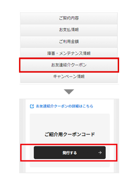 メニュー内「特典・キャンペーン」>「お友達紹介クーポン」>「発行する」でクーポンコードが確認できます。