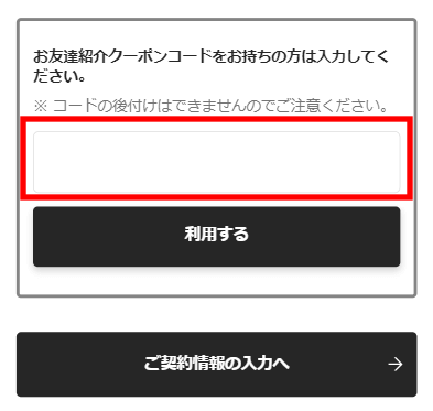 NURO 光 お申し込み画面内で、お友達から送られてきた「クーポンコード」を入力
