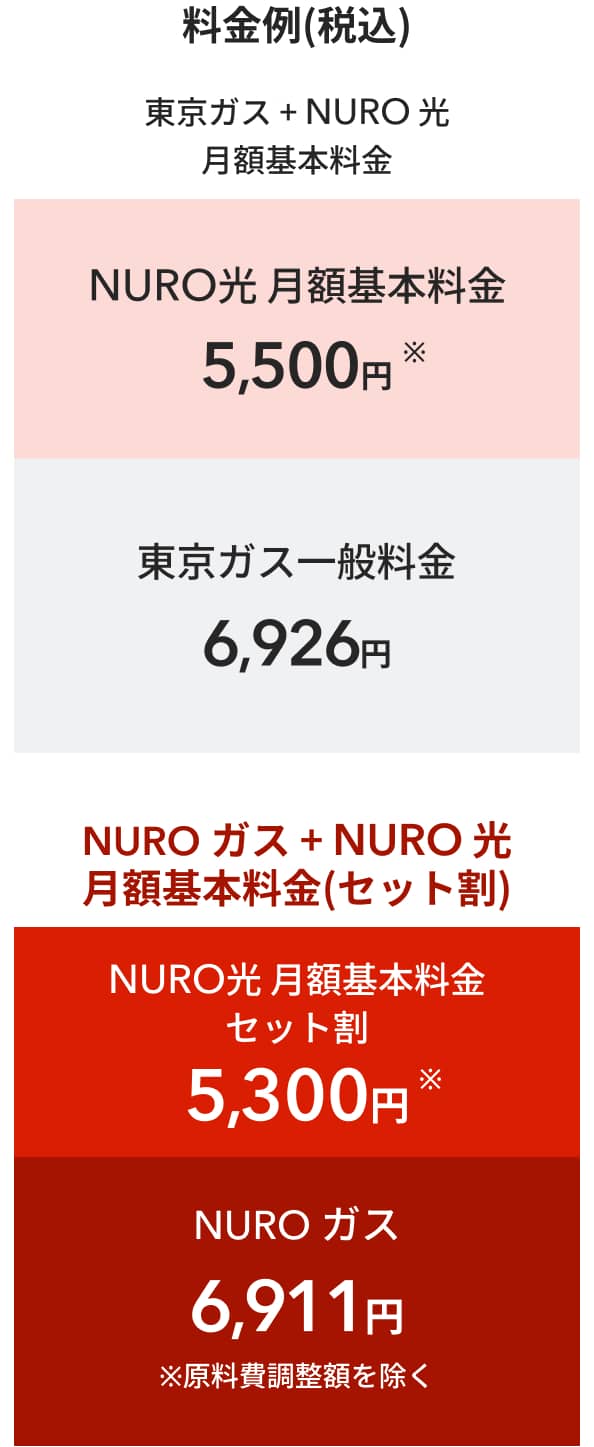 上記金額は原料費調整額を除く。原料費が高い場合は、原料費調整額により「NURO ガス」(通信セットプラン(ガス))+NURO 光 月額基本料金(セット割)が東京ガスの「一般料金」+NURO 光 月額基本料金と比較して高くなる場合があります。