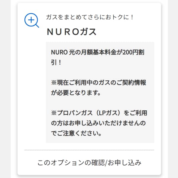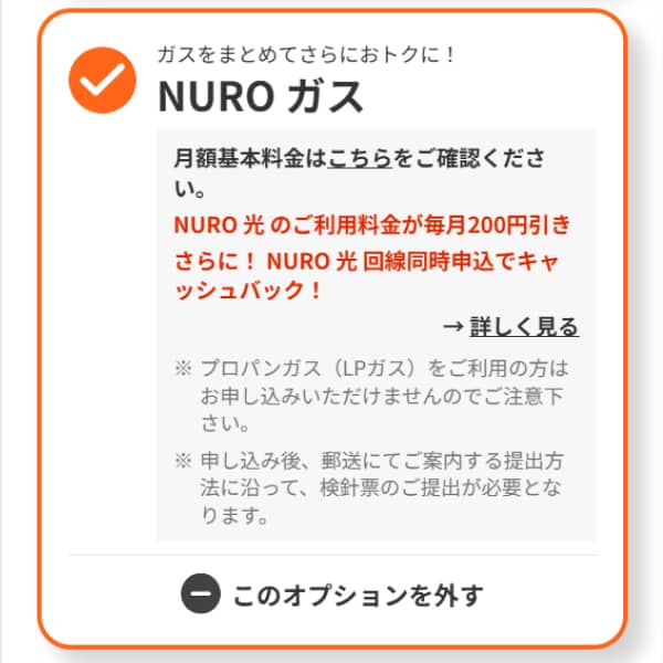 NURO 光のお申し込みフォーム、オプション選択画面で「NURO ガス」を選択