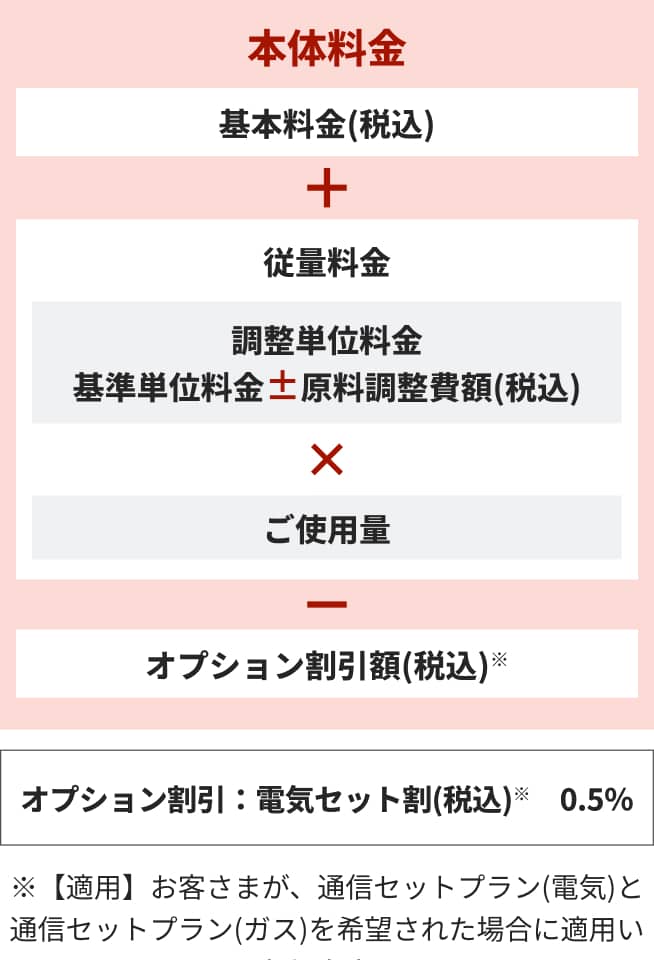 電気セット割の適用を受ける場合、ガス個別要綱で定める金額から、基本料金および従量料金それぞれ0.5パーセントを差し引いたものを料金とします。
